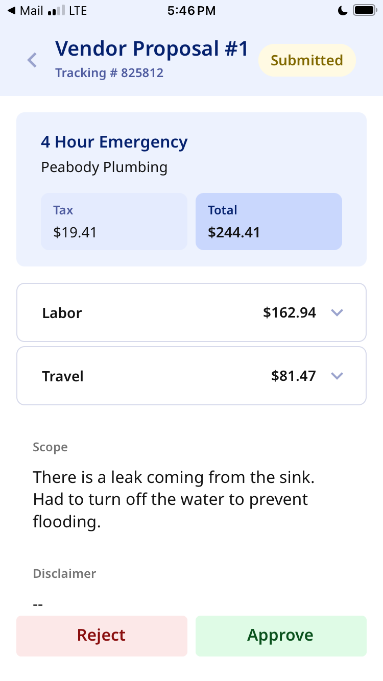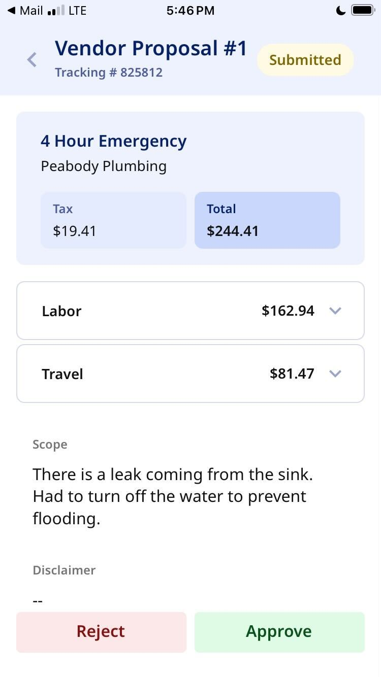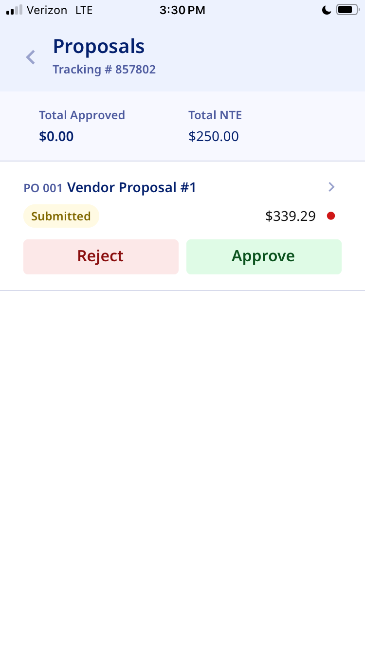 - Tap 'Approve' to send the approval to the vendor that submitted the proposal.