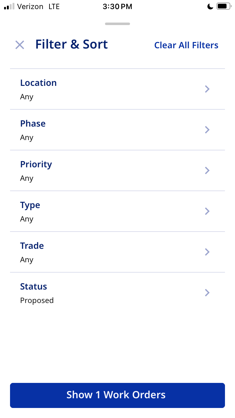 - Tap 'Show Work Orders' at the bottom of the screen once your filters are set.