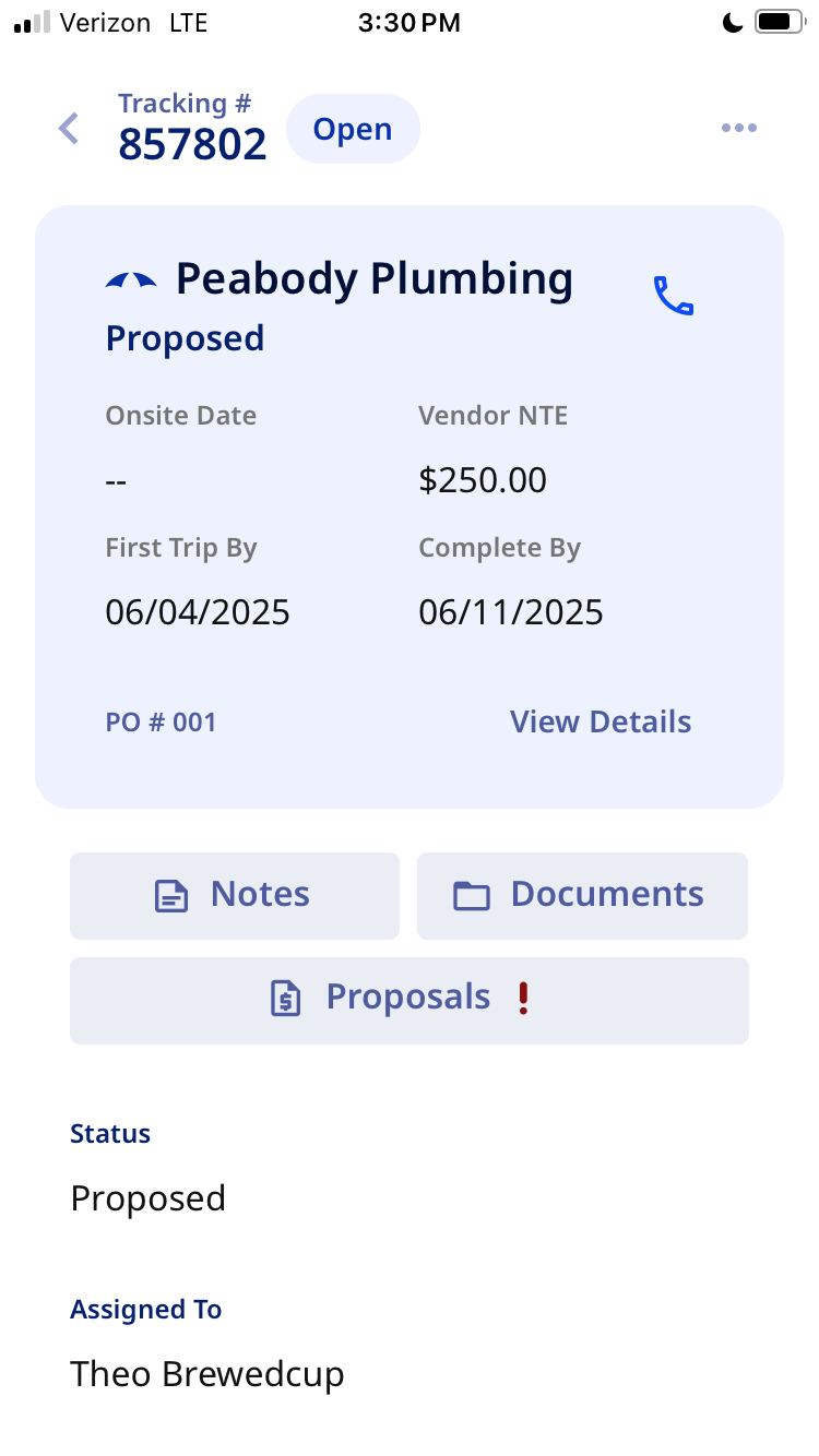 - Tap into a Work Order that is in the Proposed status and look for the Proposals '!' indicator.