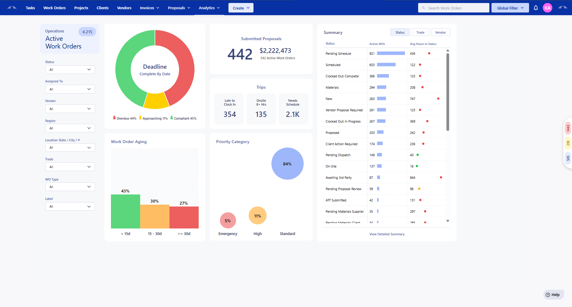 The Active Work Orders dashboard is a centralized place to manage your Work Orders. The data updates live every time the dashboard is loaded to always provide the latest information.