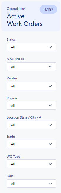 ![]() | At the top of the filter, you will see a count of all of the Work Orders that are currently being accounted for based on the filters selected. This count will represent the amount of Work Orders for all of the tiles in the dashboard. Starting off, the dashboard will display all by default. Status - Search and select any Work/Purchase Order status that populates the report. Assigned To - Allows you to filter the Work Orders down to the user that the Work is assigned to. Vendor - Allows you to filter the vendors that are assigned to the Purchase Orders. Region - If you have regions set up, this will filter all work performed for locations that are in the selected region(s). Location State / City / # - Filter the work by the Location that the Work Order is set for. Trade - Select any trade to show work within the trade. You can filter by multiple trades at once. Work Order Type - You can check how your Preventative Maintenance work compares to the Reactive work that is being done. Label - Your labels that you set for a Work Order can be used to filter the work that is shown. Labels can be set for anything you see fit. |