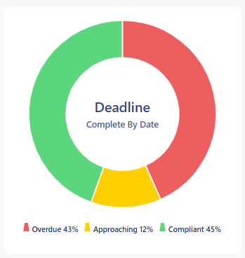 ![]() | This chart groups the Work Orders by the amount of days between now and Work Order Complete By date. The Complete By date comes from the Priority SLA and can be modified per Work Order. Overdue is any Work Order that is past the Complete By date. Approaching is any Work Order where the Complete By date is 2 or less days away, including today. Compliant is any Work Order where the Complete By date is more than 2 days away. |