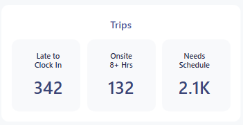![]() | Late to Clock In - Number of trips where Scheduled Date is before Now and there is no in progress clock in. Onsite 8+ Hrs - Number of clock in records that have been clocked in for 8 or more hours to a trip. Needs Schedule - Number of Purchase Orders or Work Orders if no Purchase Orders exist, that don’t have a scheduled trip. This excludes the following statuses: Materials, On Site, Vendor Proposal Required, Proposed, Confirm Complete, On Hold, Clocked Out: Complete, and Confirm Reopen. |