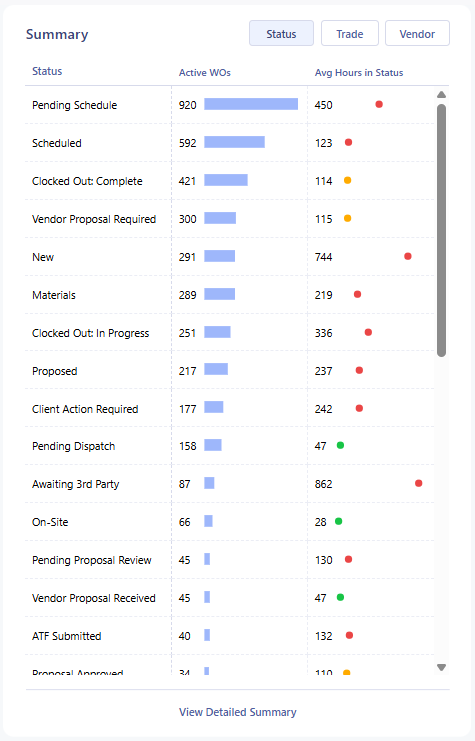 ![]() | The Status Summary page includes information about your Work Orders and the Statuses that they are in, along with the average amount of hours that your Work Orders stay in that status. The Trade Summary page breaks down all of your Work Orders by Trade. It also shows the average hours that the Work Orders remain in a status per trade. The Vendor Summary page breaks down your vendors and the amount of Active Purchase Orders they have assigned to them. The list displays in a descending order by quantity, so your most used vendors will be at the top of the list. At the bottom or each group, you can click on the View Detailed Summary option for a deeper dive into the information of the Work Orders in each grouping. For Statuses, you can break down each Status by Sub-status for a more detailed breakdown. Trades get broken into their subtrades. The Vendor detailed summary shows more details about the Purchase Orders that the Vendors have been assigned to. You can change the filters on the Summary page and the grouping as well. You can select from the following groups: Assigned To, Location, Location Region, Status, Trade, Vendor, WO Label, WO Type. |