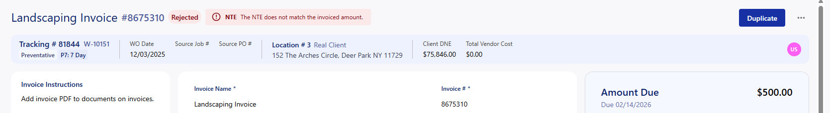Duplicate Invoice: Rejected invoices will now have the option to 'Duplicate' the invoice, this used to be the 'Clone' option in the context menu. This creates a copy of the invoice that is in the open state. This allows you to make changes to the invoice per the rejection reason of the original.