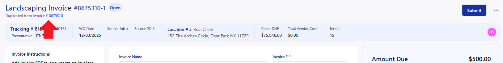 Clicking 'Duplicate' will bring you directly to the newly created invoice as well, and a link to the original invoice will be shown at the top under the invoice name.