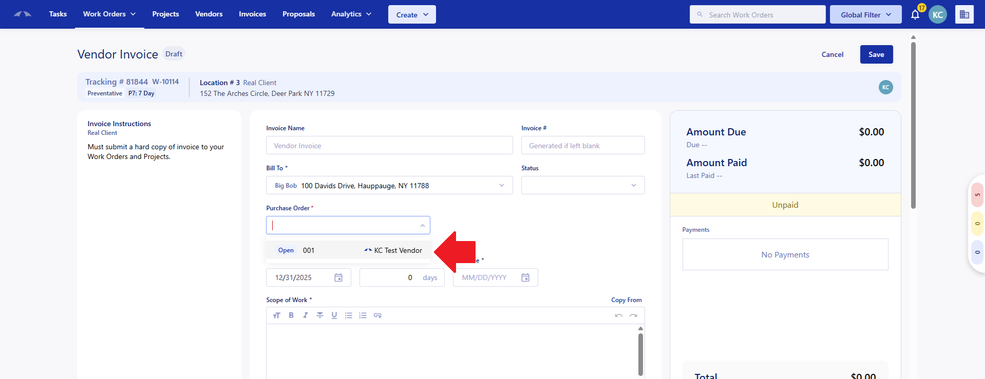 When you first click the create invoice button in the Work Order, you will be brought to a new tab with an invoice in the draft phase. You can input all of your invoice information here, or just get it started. You can upload documents, create line items, fill in the Scope of Work.