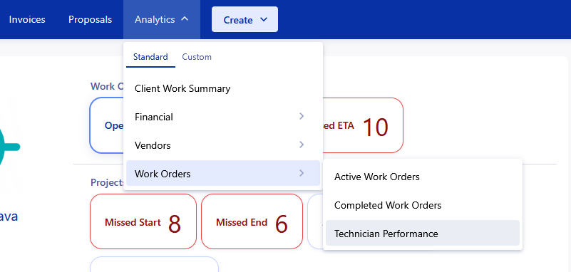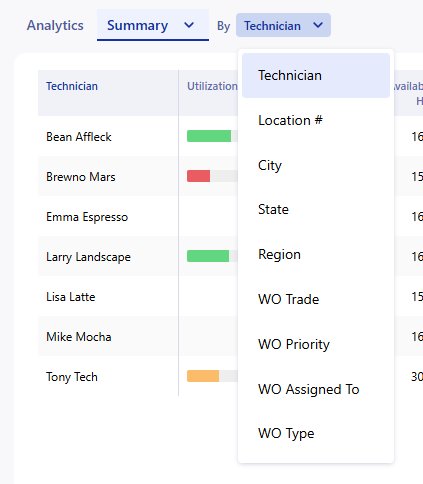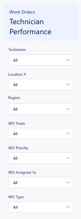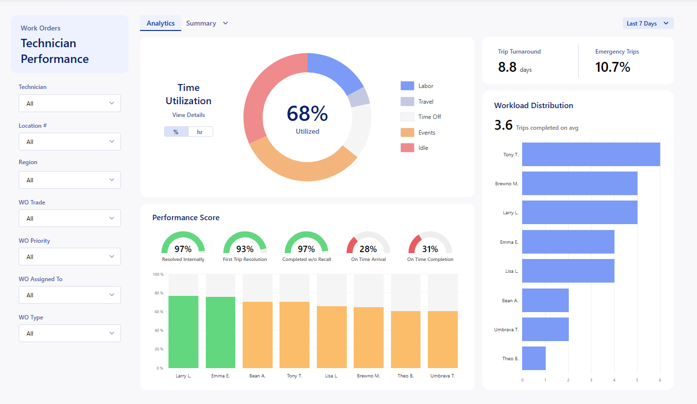 The Technician Performance Dashboard enables you to understand the utilization of your technicians and provides metrics to help you optimize your use of their time. The main use of this report is to get a breakdown of the activities that your technicians are handling within the app, and find trends in trip/work order completion. This data updates live every time the dashboard is loaded.