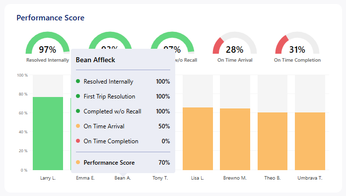 Hovering over a technicians bar will show a more detailed breakdown of that specific technicians metrics. This will automatically show in the performance score breakdown if the filter is set to that specific technician.