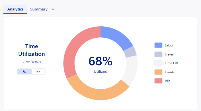 The Time Utilization section of the dashboard breaks down how effectively your technicians are using their time with Work/Events/PTO that they are assigned. These metrics are powered by the Technician Details information in each technicians profile.