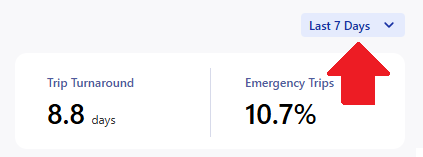 At the top right of the report, you will see a dropdown option that defaults to 'Last 7 Days'. This filter limits the report to all of the trips that were in the last 7 days. This can be adjusted to show trends over different periods of time.
