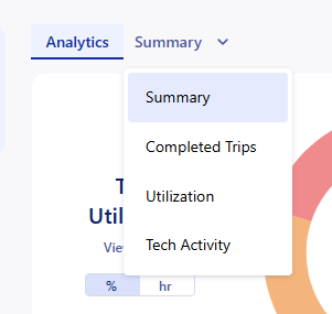 Each tab displays the list of trips with various tables of information that build up to show the data behind the corresponding tab title. Both Summary and Tech Activity have an additional filter to allow you to display the data sorted by the options in the side filter.
