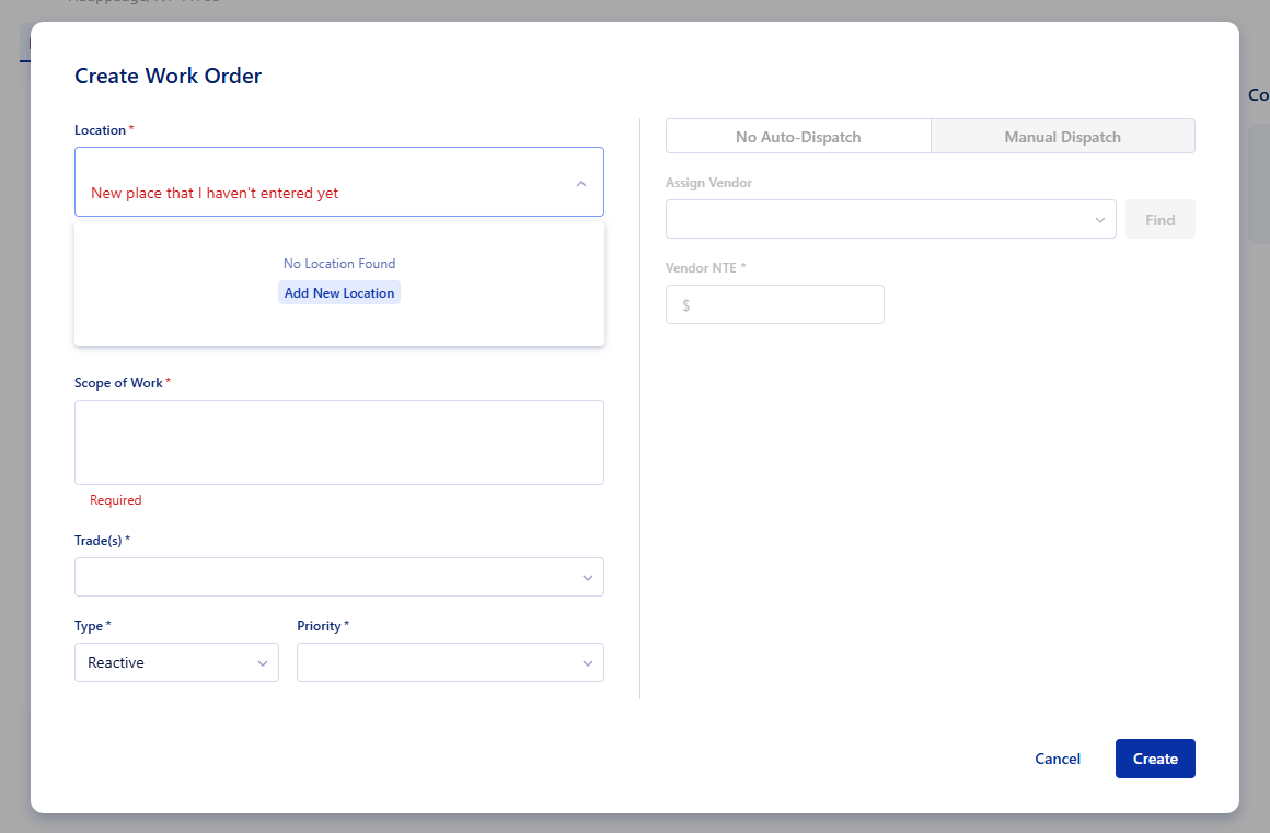 If you're creating a Work Order or Project and the location you're looking for doesn't exist yet, you'll now see a quick link to add it on the spot.