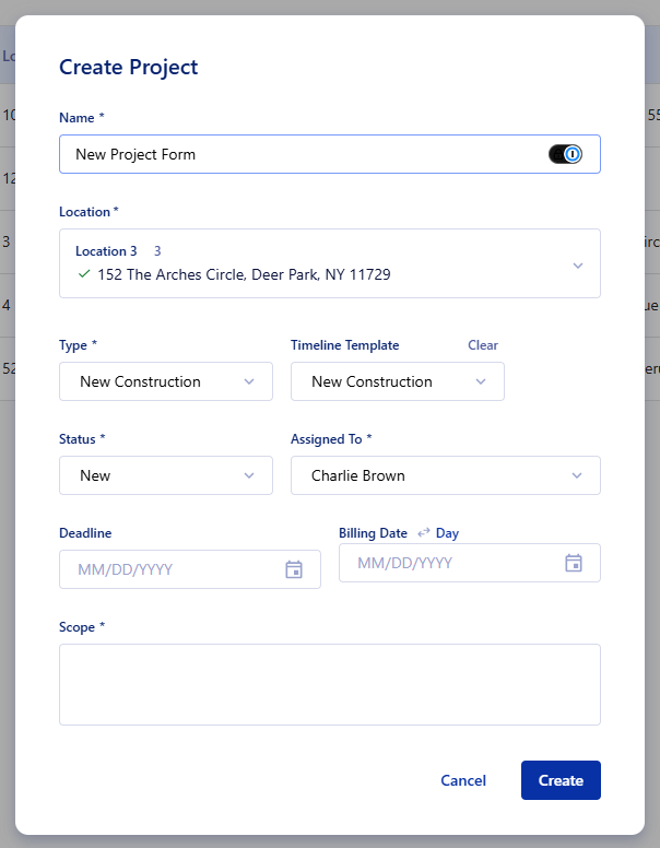 Updated Create Project Form